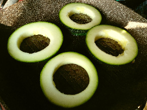 Cukinia w ogrodzie rośnie jak oszalała, to i w kuchni czas na dania z cukinią. Na początek cukiniowy przepis na śniadanie. Jajka w krążkach z cukinii są proste do wykonania. Cukinie myjemy i kroimy na grube dwucentymetrowe plastry, następnie literatką wycinamy miąższ z nasionami. Pozostałe kawałki cukinii można wykorzystać do zrobienia placków z cukinii lub do lecza. Posolone krążki kładziemy na rozgrzaną patelnie z tłuszczem i delikatnie smażymy. Jak krążki się zarumienią przewracamy na drugą stronę i wbijamy po jednym jajku w wydrążony otwór w cukinii. Przyprawiamy ulubionymi przyprawami i dalej delikatnie smażymy do momentu ścięcia się jajka, można przykryć je pokrywą. Ja popieprzyłem i posypałem przyprawą Gyros.
