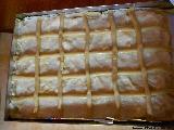 Odłożone ciasto cienko wałkujemy i kroimy w długie paski ( lub robimy wałeczki). Z pasków układamy kratkę na wierzchu budyniu. Całość jeszcze raz pieczemy ok. 25 minut w temperaturze ok. 200 stopni. Po wyjęciu studzimy.