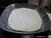 Ciasto jest mega proste do zrobienia, mieszamy w misce mąkę, sól opcjonalnie proszek do pieczenia i letnią wodę. Wody dodajemy tyle by zagniecione ciasto było miękkie i dało się rozwałkować na okrągłe placki o grubości ok. 2 mm. Wielkość placka uzależniona jest od rozmiaru naszej patelni. Placek może być trochę większy od patelni bo się skurczy podczas pieczenia. Z podanych składników wyjdzie 4 podpłomyki.