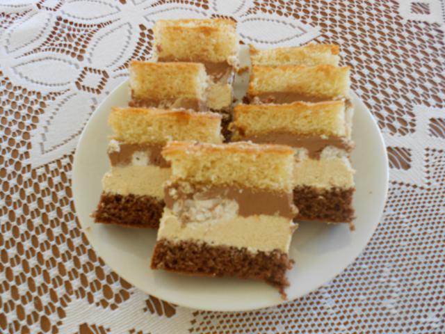 Przed przełożeniem biszkopty naponczować – np. cukrem waniliowym rozpuszczonym w 1 szkl. przegotowanej wody. Na spód dajemy ciasto kakaowe, na to masę chałwową. Na masę chałwową układamy bezy – dziubkami w dół ( potrzebna paczka bezów), na to masę kakaową i przykrywamy jasnym biszkoptem. Wierzch posypujemy cukrem pudrem